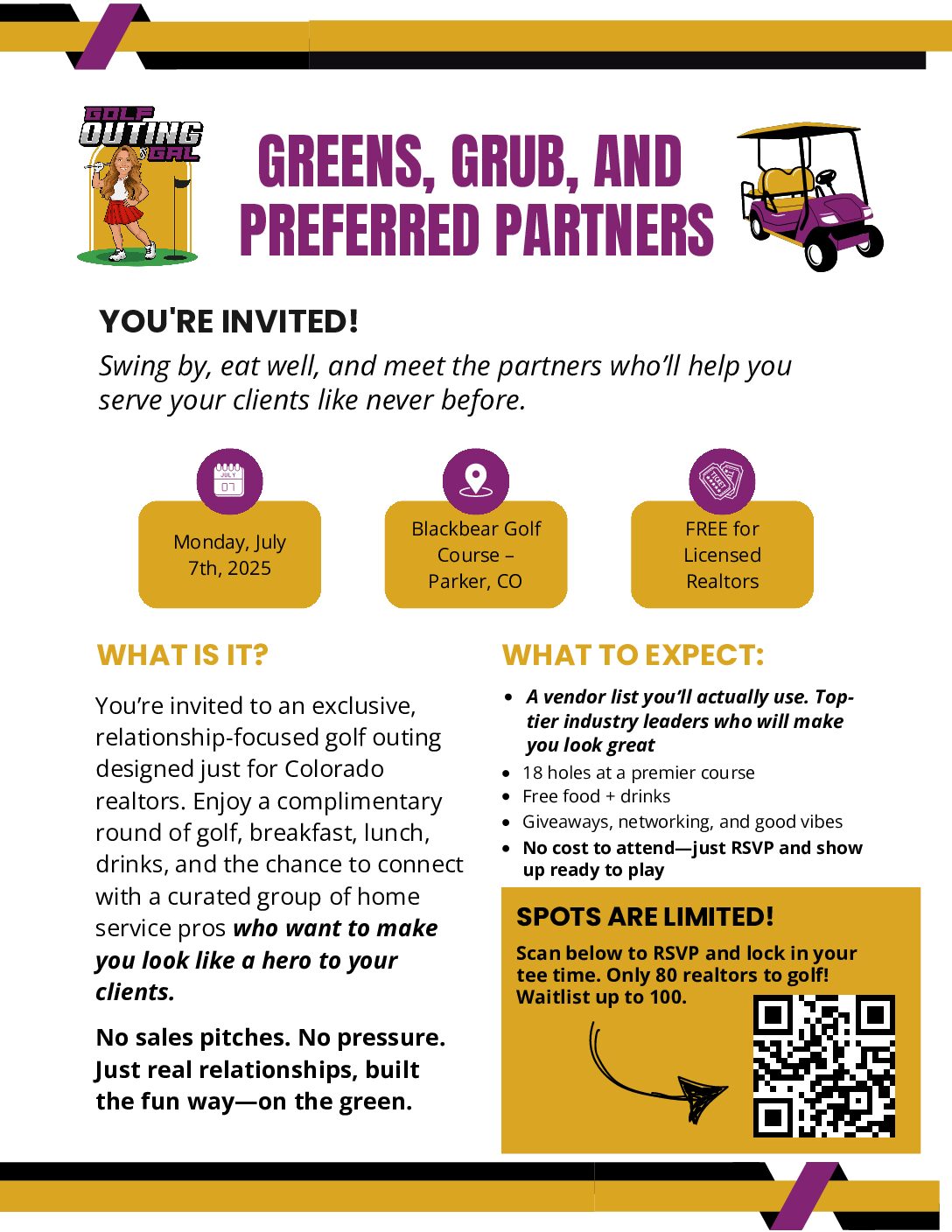 Are you a licensed CO Realtor who would enjoy a complimentary day of golf, grub, drinks, and the chance to meet top tier industry leaders who will make you